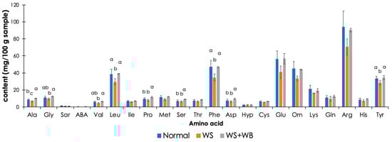 Development of the growth-related myopathies significantly affected the release of nine amino acids during in vitro protein digestion (Figure 4). The WS samples exhibited the lowest alanine, glycine, valine, leucine, phenylalanine, and tyrosine levels of the treatments (p < 0.05). The content of released glycine, valine proline, serine, and aspartic/aspartate in the WS samples did not significantly differ between normal and WS samples (p ≥ 0.05). In contrast, the WS + WB samples exhibited the highest alanine, proline, serine, and aspartic/aspartate levels (p < 0.05).