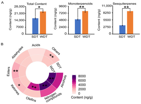 Aroma analysis of spring dry tea (SDT) and winter dry tea (WDT). (A) Concentrations of the total aroma compounds, monoterpenoids and sesquiterpenes in SDT and WDT. (B) The concentrations of substance categories in SDT and WDT. Student’s t-test was used to identify significant differences (* p < 0.05; ** p < 0.01).