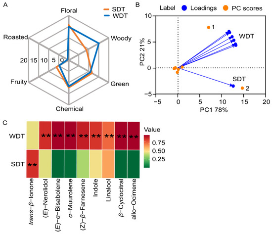 Aroma analysis of dry tea (DT). (A) Aroma radar map of spring dry tea (SDT) and winter dry tea (WDT). (B) Principal component analysis (PCA) of volatile components of SDT and WDT. (C) The content of important aroma compounds in SDT and WDT. Student’s t-test was used to identify significant differences (** p < 0.01).