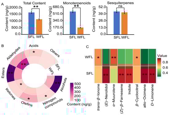 Aroma analysis of fresh leaves (FLs). (A) Concentrations of total aroma compounds, monoterpenoids and sesquiterpenes in spring FLs (SFL) and winter FLs (WFL). (B) The contents of substances in various chemical categories in SFLs and WFLs. (C) The concentrations of important aroma components in SFLs and WFLs. Student’s t-test was used to identify significant differences (* p < 0.05; ** p < 0.01; ns indicates no significant difference).