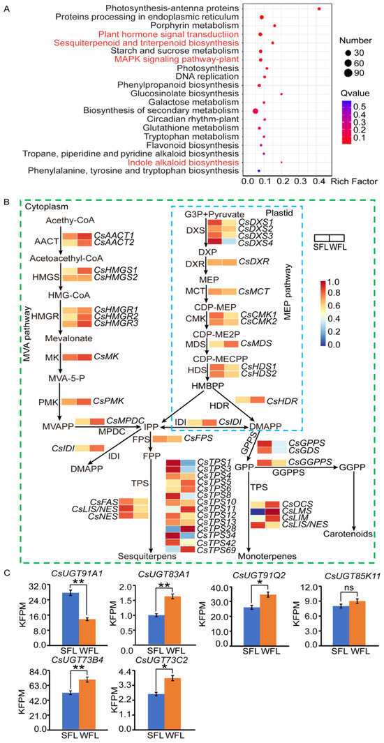 Analysis of differentially expressed genes (DEGs) in spring (SFL) and winter fresh leaves (WFL). (A) Compared to SFL, DEGs of WFLs exhibited distinct enrichment within KEGG pathways. (B) The terpene biosynthesis pathway, with relative expression of related genes in WFLs vs. SFLs. Abbreviations: AACT, acetoacetyl-CoA thiolase; HMGS, 3-hydroxy-3-methylglutaryl synthase; HMGR, 3-hydroxy-3-methylglutaryl-CoA reductase; MK, mevalonate kinase; PMK, phosphomevalonate kinase; MPDC, mevalonate diphosphate decarboxylase; DXP, 1-deoxy-D-xylulose 5-phosphate; DXS, DXP synthase; DXR, 1-deoxy-D-xylulose 5-phosphate reductoisomerase; MCT, 2-C-methyl-D-erythritol 4-phosphate cytidylyltransferase; CMK, 4-(cytidine 5′-diphospho)-2-C-methyl-D-erythritol kinase; MDS, 2-C-methyl-D-erythritol 2,4-cyclodiphosphate synthase; HDS, 4-hydroxy-3-methylbut-2-enyldiphosphate synthase; HDR, 1-hydroxy-2-methyl-2-(E)-butenyl-4-diphosphate reductase; IDI, isopentenyl pyrophosphate isomerase; FPP, farnesyl pyrophosphate; FPS, FPP synthase; GGPP, geranylgeranyl pyrophosphate; GGPPS, GGPP synthase; LMS, limonene synthase; GPP, geranyl pyrophosphate; GPPS, GPP synthase; IPP, isopentenyl pyrophosphate; DMAPP, dimethylallyl pyrophosphate; TPS, terpene synthase; FAS, farnesene synthase; AFS, α-farnesene synthase; NES, nerolidol synthase; LIS/NES, linalool/nerolidol synthase; LIM, limonene synthase; OCS, ocimene synthase; GDS, geranylgeranyl diphosphate synthase. (C) Expression levels of CsUGT91A1, CsUGT83A1, CsUGT91Q2, CsUGT85K11, CsUGT73B4 and CsUGT73C2 in SFLs and WFLs. Student’s t-test was used to identify significant differences (* p < 0.05; ** p < 0.01; ns indicates no significant difference).