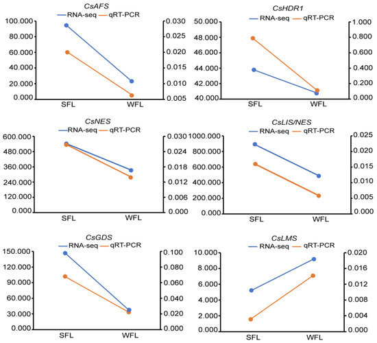 Comparison of six random unigenes’ expression via quantitative real-time PCR (qRT-PCR) with transcriptome sequencing results. The left Y-axis represents the qRT-PCR results, and the right Y-axis represents the transcriptome sequencing results. AFS, alpha-farnesene synthase; HDR, 1-hydroxy-2-methyl-2-(E)-butenyl-4-diphosphate reductase; NES, nerolidol synthase; LIS/NES, linalool/nerolidol synthase; GDS, geranylgeranyl diphosphate synthase; LMS, limonene synthase.