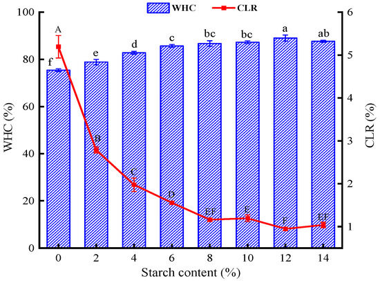 Effect of different contents of tapioca starch on the WHC and CLR of surimi in the surimi gel. The data with an identical letter indicate no significant difference between them (p > 0.05).