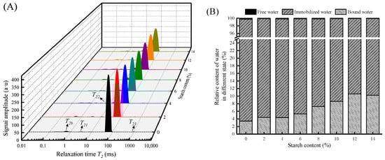 The relative contents of water in different states in the surimi gel are shown in Figure 2B. The immobilized water content accounted for more than 89%, and the other two types of water content accounted for less. With the addition of tapioca starch, the higher the starch content, the more the bound water content increased and the free water content decreased. The gels had the best ability to bind water molecules when the starch addition amount was 12%. On the one hand, a small amount of free water in the gel is converted into bound water, stabilizing the water molecules in the gel network [25]. On the other hand, starch contains numerous hydroxyl groups, which helps to bind more water [7]. Therefore, starch fills the gel network to some extent and could reduce the gel pore size, preventing water from leaking out of the gel pores.