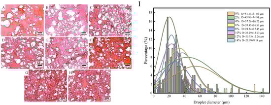 Effect of different contents of tapioca starch on the light microscopic picture (×200) and pore size distribution of surimi gels. (A): control; (B–H): the surimi gel containing tapioca starch in concentrations of 2, 4, 6, 8, 10, 12, and 14 per 100 g of surimi, respectively; (I): Average cavities of surimi gel with different contents of tapioca starch.