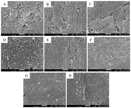 Effects of different contents of tapioca starch on the scanning electron microscope photograph (×15,000) of the surimi gel. (A): control; (B–H): the surimi gel containing tapioca starch in the concentrations of 2, 4, 6, 8, 10, 12, and 14 per 100 g of surimi, respectively.