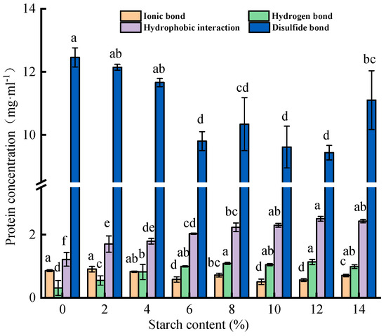 In general, heat exposure induces the opening of myofibrillar proteins’ helical structures, with more sulfhydryl groups and hydrophobic amino acids exposed, thereby producing covalent crosslinking of disulfide bonds and hydrophobic interactions [30]. Figure 5 shows that the disulfide bonds and hydrophobic interactions contributed more to surimi gel matrix maintenance, while ionic and hydrogen bonds contributed less. Tapioca starch decreased the disulfide and ionic bonds but promoted hydrophobic interactions and hydrogen bond formation (p < 0.05). Tapioca starch causes a loss of thiol group content by releasing hydroxyl groups and reacting with thiol groups, hindering the generation of disulfide bonds [31]. Therefore, with the addition of tapioca starch, disulfide bonds showed a downward trend (p < 0.05). This conclusion is similar to a previous finding that the potato-starch-induced reduction in disulfide bonds may be influenced by the starch granular structure [10]. This change may be because, during the heating process, tapioca starch binds to the thiol groups on myofibrillar proteins and undergoes a non-disulfide bonding polymerization reaction [32].