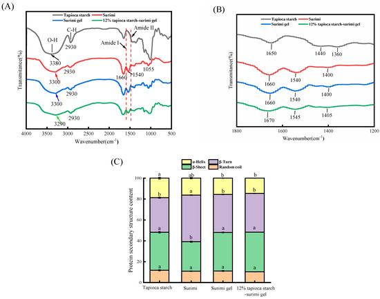 FT-IR spectral of tapioca starch, surimi, surimi gel, and tapioca starch–surimi gel (tapioca starch content of 12%) (A,B), and the change in secondary structure (C). The data with an identical letter indicate no significant difference between them (p > 0.05).