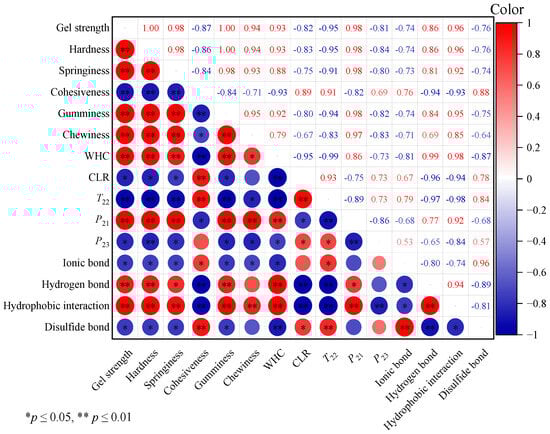 Correlation analysis between the gel strength of surimi gel and other indexes. (The red number and circle represent a positive correlation, and the blue number and circle represent a negative correlation. The closer the correlation coefficient is to 1.00, the more significant the positive correlation between the two is, and vice versa).