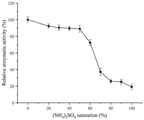 The SSADH in germinated Tartary buckwheat extract was precipitated using varying saturation levels of (NH4)2SO4, and the residual enzyme activity of SSADH in the supernatant was determined following centrifugation. The corresponding results are illustrated in Figure 1. The SSADH activity in the supernatant significantly decreased as the saturation of (NH4)2SO4 increased from 50% to 80%, indicating that the precipitation of SSADH was most effective at between 50% and 80% (NH4)2SO4 saturation. Therefore, (NH4)2SO4 in a saturation range of 50% to 80% was selected for precipitating the SSADH extract from germinated Tartary buckwheat.