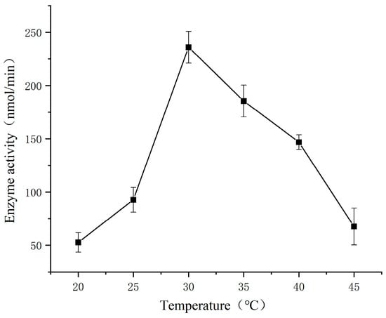 As shown in Figure 3, at a concentration of 0.2 mmol/L and a temperature of 30 °C, the SSADH activity of germinated Tartary buckwheat exhibited an increasing trend with rising pH until it reached its peak value of 275.12 nmol/min at pH 8.6. Subsequently, further increases in pH led to a decline in SSADH activity due to the influence of reaction medium pH on the enzymatic reactions, which exhibited optimal catalytic efficiency within specific pH ranges. Deviation from this optimum range results in reduced enzyme activity, while excessive acidity or alkalinity can render the enzyme completely inactive. The optimal reaction pH of the subunit of human SSADH was determined to be 8.5, while certain properties of purified barley SSADH exhibited similarities with those found in mammals. Notably, the optimum pH range for purified barley SSADH was observed to be between 9.0 and 10.0, suggesting that there are variations in the optimal pH among different grains [29].