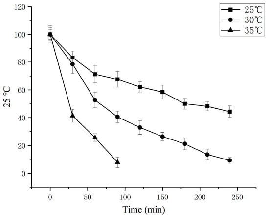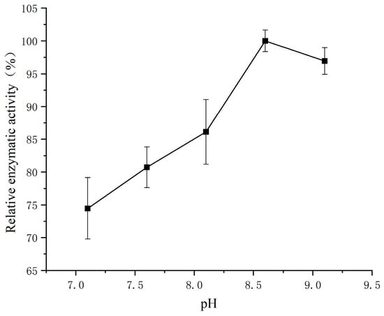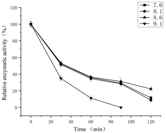 The thermal stability of germinated buckwheat SSADH was investigated at temperatures of 25, 30, and 35 °C. As depicted in Figure 9, the highest thermal stability was observed at 25 °C. The enzyme half-life of SSADH at 25 °C was 180 min, which was better than 64.5 min at 30 °C and 25.6 min at 35 °C. The catalytic efficiency of the enzymatic reaction medium is significantly influenced by its pH level due to its ability to modify the dissociation degree of amino acid groups within the enzyme’s active center [30]. Therefore, an investigation into the pH stability of germinated buckwheat SSADH was conducted under conditions with pH values ranging from 7.6 to 9.1 (Figure 10). The results indicated comparable levels of stability for pH values of 7.6, 8.1, and 8.6, with respective half-lives of 34.2 min, 32.7 min, and 36 min. At a pH value of 9.1, the enzyme exhibited poor stability, with a half-life of 23 min.