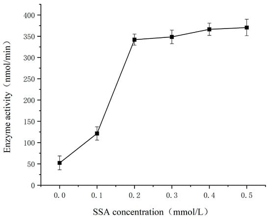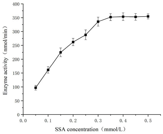 As shown in Figure 4, SSADH activity exhibited a significant increase at 30 °C and pH 8.6 within a SSA concentration range of 0–0.2 mmol/L, followed by a gradual plateauing effect within a SSA concentration range of 0.2–0.5 mmol/L. The phenomenon can be attributed to the dependence of enzymatic reaction rate on substrate concentration in an enzymatic reaction system with constant enzyme concentration, reaction temperature, and pH. At low substrate concentrations, the enzymatic reaction is accelerated by increasing substrate concentration, exhibiting a proportional relationship between reaction rate and substrate concentration. However, as the substrate concentration increases further, the rate of the increase in reaction rate is diminished. If the substrate concentration continues to rise beyond this point, the maximum limit (Vmax) of the reaction rate will be approached.