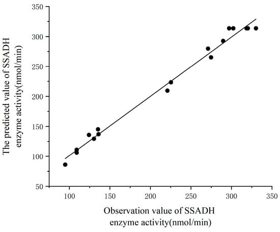 The analysis of variance (Table 4) revealed that the model was highly significant (p < 0.001), indicating its strong statistical significance. Additionally, the model also possessed no significant lack of fit (p > 0.05). The regression equation demonstrated a determination coefficient of 0.9892 and a coefficient of variation of 6.45. Moreover, the value of the adjusted determination coefficient (R2adj = 0.9752) suggested that this model effectively analyzed and predicted the relationship between factors and response values, explaining approximately 97.52% of their variations. Furthermore, the comparison between the predicted values of SSADH activity (Figure 5) showed a very significant correlation. Moreover, with an SNR value exceeding 21.187 compared to a threshold of 4, it indicated that this model exhibited excellent fit with experimental data and possessed minimal experimental error, thus enabling an effective analysis of the relationship between germinated Tartary buckwheat’s SSADH activity and its respective variables.