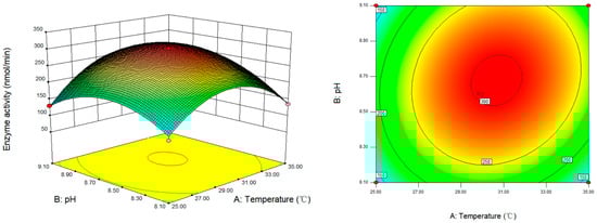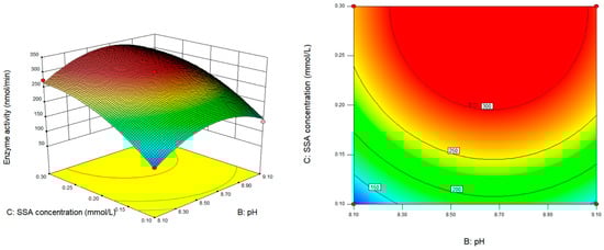 The Box–Behnken design was used, and response surface analysis tests were conducted using temperature, pH value, and SSA concentration as independent variables, while enzyme activity was considered as the response variable. The obtained results are presented in Table 3. Multiple regression fitting of the data was performed using Design Expert V8.0.6 software. The quadratic polynomial equation describing the relationship between SSADH enzyme activity and the independent variables (temperature, pH value, and SSA concentration) in this study is provided in Equation (1) below: