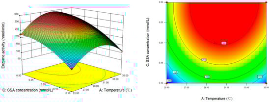 Response surface and contour map of the interaction between temperature and SSA concentration on SSADH enzyme activity of germinated Tartary buckwheat (pH 8.6).