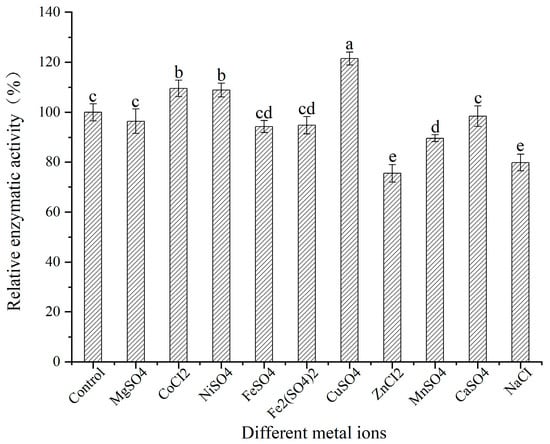The impact of various metal ions on the activity of SSADH in germinated Tartary buckwheat was investigated, with the enzyme reaction without the addition of metal ions serving as a control group. Cu2+, Co2+, and Ni2+ demonstrated an activating effect on SSADH activity in germinated Tartary buckwheat (Figure 11), with Cu2+ exhibiting the most significant impact (p < 0.05), being 1.21 times higher than that of the control group. Conversely, Zn2+, Mn2+, and Na+ inhibited SSADH activity in germinated Tartary buckwheat, with Zn2+ exerting the strongest inhibitory effect (p < 0.05). Mg2+, Fe2+, Fe3+, and Ca2+ had no discernible influence on SSADH activity, showing no statistically significant differences among them (p > 0.05). Teisseire et al. [31] also demonstrated that some metal ions can enhance the activities of catalase and certain peroxidases, which is consistent with our results.