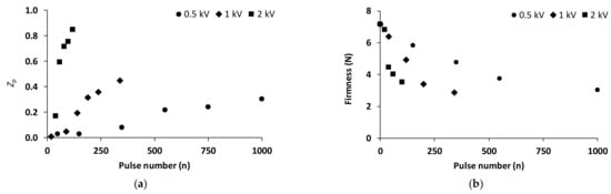 (a) Cell rupture index Zp of fresh-cut potatoes during PEF treatment and (b) firmness (Force, N) of fresh-cut potatoes, after PEF treatment (field intensity: 0.5, 1, 2 kV/cm; number of pulses: up to 1000).