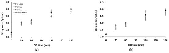Mass transfer: (a) water loss (WL) and (b) solid gain (SG) during osmotic dehydration (OD) of untreated and PEF pre-treated (different pulse values) potatoes. Samples: Untreated, PEF200, PEF500, PEF1000 (Values are mean ± standard error).