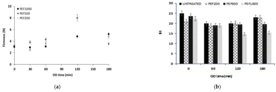 (a) Firmness (force, N) and (b) browning index (BI) values of PEF pre-treated OD potatoes during OD (0, 60, 120, 180 min). Samples: Untreated, PEF200, PEF500, PEF1000 (Values are mean ± standard deviation/error).