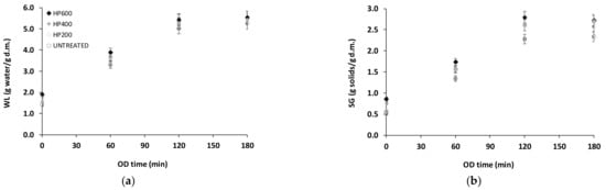 Figure 4 presents the dehydration curves in terms of water loss (WL) and solid gain (SG) for untreated and HP treated samples. HP pre-treatment significantly affected both water loss and solid gain of osmotically dehydrated potatoes. A 36% and 53% (approximately) increase in WL and SG, respectively, was calculated for 120 min of OD of HP treated samples. WL and SG remained stable after 120 min of OD treatment for both untreated and HP treated samples. It seems that HP increased the cell permeability and facilitated to some degree the diffusion during osmotic dehydration of potato by increasing both moisture and solid diffusion (Figure 4a,b) [70,71]. In the present study, HP treatment enhanced SG more than WL. Calculated DEI values ranged from 1.93 to 2.03 for OD times 120 and 180 min of HP treated samples compared to values of 2.30 and 2.25 for OD times 120 and 180 min of untreated samples, indicating that SG was enhanced by the high pressures applied (no statistically significant differences were detected between HP pre-treated samples at 200 (HP200), 400 (HP400), and 600 (HP600) Mpa regarding DEI index; p > 0.05). The dry weight of HP pre-treated osmotically dehydrated samples ranged from 0.446 to 0.473 g/g initial weight (compared to 0.152 g/g initial weight of the untreated sample). Sopanangkul et al. reported that the diffusion coefficient of sucrose in potatoes significantly increases with pressure up to 600 MPa at 20 and 40 °C [70]. Dourado et al. confirmed that application of appropriate levels of pressure (100–400 MPa) can be used to accelerate mass transfer during ingredient infusion into potato tissue and to reduce processing times. According to Dourado et al., applying proper levels of pressure (100–400 MPa) can be used to speed mass transfer during ingredient infusion into potato tissue and shorten processing times [8]. They concluded that higher pressures above 400 MPa induce starch gelatinization and hinder diffusion. In the present study, no statistically significant differences were observed between HP treated samples under different processing conditions (200, 400, 600 MPa; Samples HP200, HP400, HP600). The effectiveness of HP as a pre-treatment to air drying has also been demonstrated at pressures as low as 200 MPa [55]. On the contrary, Kingsly et al. [71] reported that air drying of pineapple slices was enhanced only for treatment pressures exceeding 500 MPa. Similar observations were made by Santos et al. [72] for air drying of cashew slices. The exact effects that HP treatment has on subsequent processing are therefore highly dependent both on the type of plant tissue treated and on the dehydration method used.