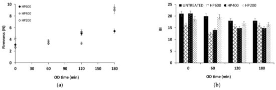 (a) Firmness (force, N) and (b) browning index (BI) of HP pre-treated potatoes. Samples: UNTREATED, HP200, HP400. HP600 (Values are mean ± standard deviation/error).