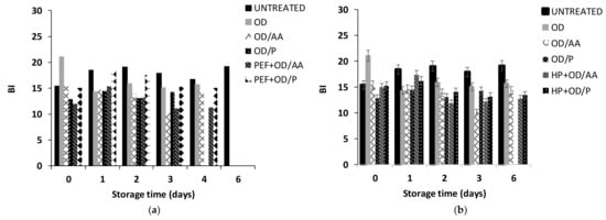 BI of untreated (control), osmo-dehydrated (OD, OD/AA, OD/P), PEF osmo-dehydrated (PEF+OD, PEF+OD/AA, PEF+OD/P), and HP osmo-dehydrated (HP+OD/AA, HP+OD/P) potatoes were monitored during cold storage (4 °C) (Figure 6a,b). BI of OD samples was calculated to be 70% lower than the BI of untreated samples and 28.5% lower than the BI of OD/AA samples (non-PEF pre-treated). The use of the anti-browning agents, ascorbic acid (AA) and papain (P), in the osmotic solution (both non-PEF and PEF pre-treated) improved the color retention for PEF pre-treated samples (OD/AA, OD/P and PEF+OD/AA, PEF+OD/P compared to OD). PEF+OD/P samples presented an increase in the browning rate compared to PEF+ODAA that can be attributed to the partial inhibition of PPO by papain (by 70%) compared to the complete inactivation of PPO using ascorbic acid.