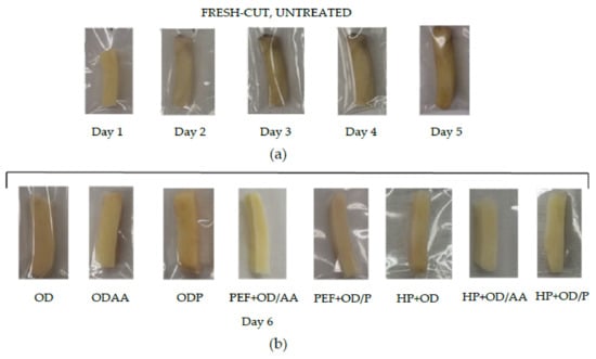 (a) Untreated fresh-cut potatoes stored at 4 °C for 6 days, and (b) OD (OD, OD/AA, OD/P), PEF pre-treated OD (PEF+OD/AA, PEF+OD/P) and HP pre-treated OD (HP+OD, HP+OD/AA, HP+OD/P) potatoes during storage (at 4 °C).