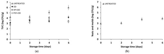 Figure 8 shows the change in total microbial load of nontreated and PEF/HP pre-treated OD potatoes during cold storage. Microbial growth (total viable counts TVC) was observed for nontreated potato samples equal to 4 log(CFU)/g after two days of storage and 6 log(CFU)/g at the end of storage. The growth rate was calculated to be k = 0.569 d−1 (Baranyi model; DMfit programe (IFR, Institute of Food Research, Reading, UK) [75]. The total viable counts for OD treated (non-pre-treated and PEF/HP pre-treated) were <4 log(CFU)/g for 6 days of cold storage. Yeasts and molds in OD treated (non-pre-treated and PEF/HP pre-treated) samples were at undetectable levels (<10 CFU/g). In the case of the untreated sample, yeast growth was observed after 2 days of storage, with a value of 3.74 log(CFU)/g at the end of storage.