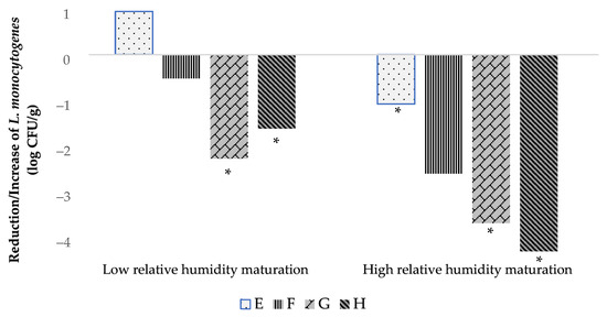Regarding L. monocytogenes, the levels of this pathogen in the E batch (uninoculated with LAB) increased or were maintained at initial inoculation levels during the first 15 days of ripening. This can be explained because the conditions of aw (around 0.98) and pH (between 5.8–5.3) do not inhibit L. monocytogenes and even promote its growth [31]. During the second half of maturation (from day 30 to 60) of the E batch, this pathogenic bacterium either remained at the inoculation level or showed a slight reduction of about 1 log CFU/g, probably due to the cheese values of aw and pH (aw ≤ 0.94 and pH ≤ 5.4) that do not favor the growth of L. monocytogenes [27]. However, in LAB-inoculated batches (F, G, and H) of both Low and High RH elaborations, continuous reductions of L. monocytogenes throughout the ripening time were observed, even though, in the first days of ripening, the aw and pH conditions could promote growth of this pathogen [31]. Complete maturation of LAB-inoculated cheeses was able to reduce L. monocytogenes to the range of 1.51 to 4.07 log CFU/g (Figure 1).