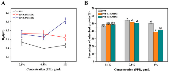 Changes of particle size (D43, A) and percentage of adsorbed proteins (AP, B) at different concentrations of PPI and MDG. The same lowercase letters marked in the figure represent no significant difference; different lowercase letters indicate significant differences.