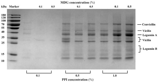 The interfacial proteins from the PPI-MDG-stabilized emulsion were collected for the SDS-PAGE measurement, the semi-quantitative method. Through this detection, the differences in the subunit composition of PPI were determined to indicate the protein displacement at the oil–water interface. In Figure 2, the color of protein bands was too light at 0.1% PPI compared with other samples. With the MDG addition, the interfacial protein bands almost disappeared. When the PPI concentration was increased to 0.5%, the SDS-PAGE profiles showed that the interfacial adsorbed proteins (vicilin and legumin B) were decreased according to the missed corresponding bands. The semi-quantitative results suggested that vicilin (25–35 kDa) and legumin (13–20 kDa) were displaced by MDG at the interface. This result was observed by the SDS-PAGE profiles; meanwhile, an accurate measurement confirmed its necessity.