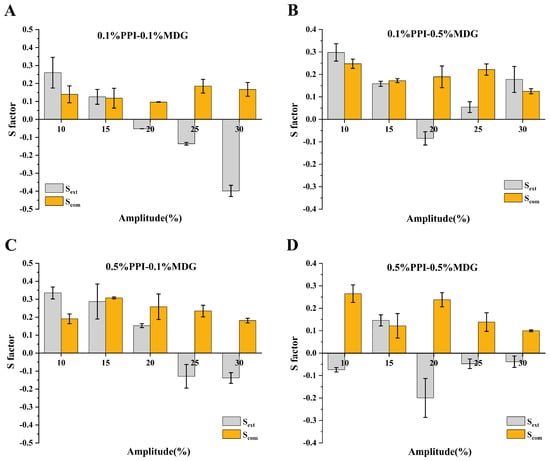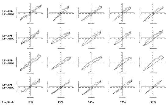 The lower MDG concentration was used for the faster relaxation of the interfacial tension. The surfactant interfacial properties were related to the interfacial film structure. The interfacial behaviors were attributed to the protein exchanges at the interface, as well as the rearrangement of adsorbed protein at the interfacial film. As shown in Figure 6, the positive value of S factor represented the interface-hardening response, while a negative value of S factor represented the interface-softening response. During the process, all samples showed strain-softening behavior, and the degree of strain softening increased with the increasing amplitude. Similarly, strain-hardening behavior was presented during compression, and the degree of strain hardening increased with the increasing amplitude [35]. Some significant differences in the shape of Lissajous curves were observed at 0.5% PPI. The Lissajous curves narrowed as the MDG concentration gradually increased, suggesting that the interfacial responses were more direct and rapid. The interactions between proteins and LMW surfactants resulted from the hydrophobic or electrostatic interactions, thus affecting the initial structure and interfacial conformation of protein molecules [36,37]. The protein interfacial rearrangement at the oil–water interface was caused by the protein-inherit flexibility and protein hydrophobicity.