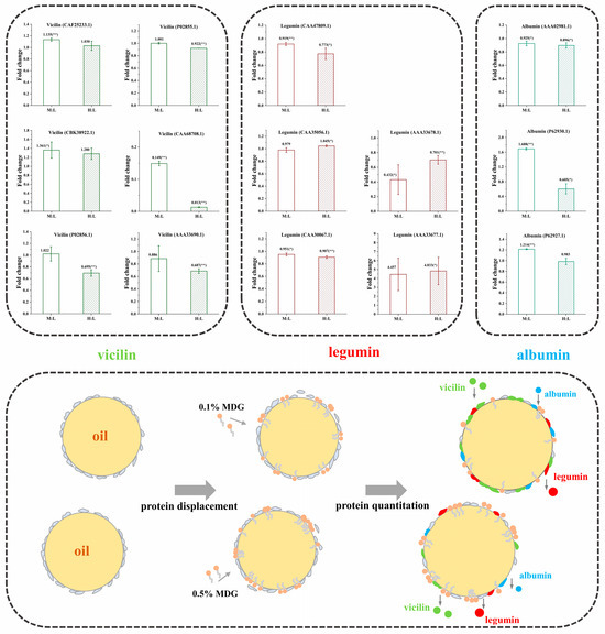 Vicilin (7S) is the trimeric molecule in which each monomer is composed by some subunits. The physicochemical and conformational properties of vicilin depended on its amino acid composition (especially the relative ratio of acidic to basic charged amino acids). Moreover, this ratio influenced its tertiary conformation, quaternary conformation, protein flexibility and thermal stability. In Figure 7, at the quantitative analysis of 0.5% PPI0.5% MDG samples, the vicilin contents were significantly decreased. Combined with the interfacial adsorption results, the increased MDG concentration at 0.5% PPI resulted in the decrease in the interfacial adsorption rate and adsorption capacity. Simultaneously, when the MDG concentration was 0.1%, the vicilin increased. In Table S1, when the MDG concentration was 0.1%, the relative content of vicilin (N4-N5) increased the N17 and N19 as up-regulated proteins. In addition, legumin (11S) is one type of protein with a hexameric structure, in which each monomer contains subunits linked by disulfide bonds. In the 0.5% PPI0.1% MDG samples, the legumin content averagely decreased by 23.27%, indicating that legumins were gradually displaced from the interface. It was speculated that more binding sites appeared at the interface, and other kinds of proteins adsorbed to the interface slowly. There remained a dynamic equilibrium during the process.
