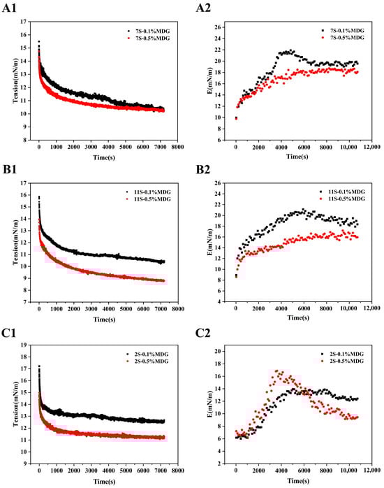According to the quantitative results, the interfacial rheological behaviors between the component proteins of PPI and MDG were further investigated. The results showed that the interfacial complex modulus increased firstly and then decreased at low concentration of MDG [40]. In Figure 8, the greatest decrease in interfacial tension was observed at 11S when the MDG concentration was 0.5%. The complex moduli of 7S0.5% MDG and 11S0.5% MDG were stable in the range of 16.5–17.5 mN/m, which was higher than that of 2S0.5% MDG. The complex modulus at the interface of the 2S–0.5% MDG samples first increased and then decreased rapidly, suggesting the significant decrease in the content of albumin. In combination with the high concentration of MDG in the quantitative results, the significant desorption of albumin was the explanation for the decrease in the complex modulus at the oil–water interface [41,42].