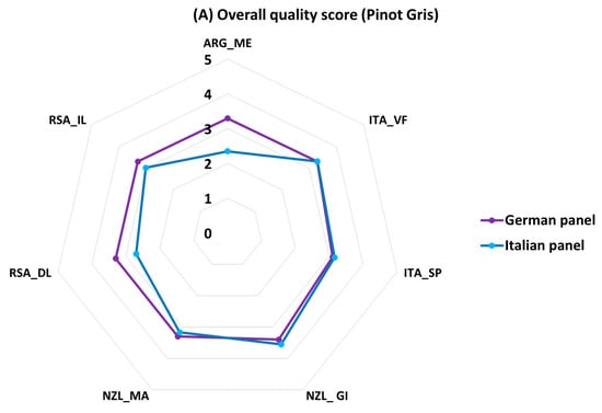 (A) Spider plot of the overall quality score (average values of each panel) given by the German and the Italian panels for Pinot Gris. (B) Spider plot of the overall quality score (average values of each panel) given by the German and the Italian panels for Pinot Noir.