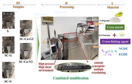 Similarly, without changing any other extruder settings, starch was sequentially modified with different types of crosslinker solutions to obtain the corresponding modified starch gel samples (SC-G, SC-N, SC-Ca-G1, SC-Ca-G2, SC-Ca-G3, SC-Ca-G4, SC-Ca-N1, SC-Ca-N2, SC-Ca-N3, SC-Ca-N4), respectively (Figure 1).
