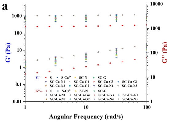 In order to investigate the effect of modification on the texture and structural characteristics of the starch hydrogels, the samples were subjected to frequency scanning (Figure 2a,b) [14]. As shown in Figure 2a, the unmodified sample S exhibited the lowest storage modulus (G′), and the samples (SC-N and SC-G) with the addition of the esterified–etherified dual crosslinker system showed a slight enhancement in G′. This may be because the esterified and etherified crosslinker molecules compete for crosslinking sites and thus inhibit the overall crosslinking reaction of the sample. Notably, there is a significant enhancement in the G′ of the starch gel samples after adding charged metal ions to the esterified–etherified dual crosslinker system. The ion synergistically double crosslinking modified SC-Ca-N3 and SC-Ca-G2 showed the highest G′ in their series of samples, 452 ± 7% and 405 ± 5% of the G′ of the unmodified sample S, respectively. It can be shown that the metal ions have a synergistic enhancement effect on the esterification–etherification double crosslinking reaction, and the enhancement may be related to the electrostatic interaction force between the Ca2+ and the crosslinker molecules [21,22]. In addition, the G′ of SC-Ca-N4 is reduced compared to SC-Ca-N3; similarly, the G′ of SC-Ca-G3 and SC-Ca-G4 is reduced compared to SC-Ca-G2. This suggests that the excessive addition of etherified crosslinkers can disrupt the ionic synergistic reinforcement effect, reducing the overall degree of crosslinking.