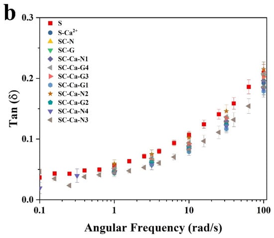 Furthermore, the storage modulus (G′) was greater than the loss modulus (G′) for all gel samples, demonstrating that the starch gels had a solid gel structure. The tanδ values were used to comprehensively assess the viscous and elastic behavior of the samples (Figure 2b). The results showed that the tanδ values ranged between 0.02 and 0.25, further confirming that the starch had transformed into a solid gel state [23]. The frequency dependence of the samples’ G′ and G″ before and after modification was quantified through fitting a power law model (Table 2) and was expressed in terms of n′ and n″, respectively. The SC-Ca-N3 had the lowest n′ value, indicating that the ionic synergistic double crosslinking reaction reduced the starch gel’s frequency dependence. This result also confirms that the ionic synergistic modification produced a stronger crosslinked structure in the gel and suppressed an effect of shear on the gel structure in LVR [15].