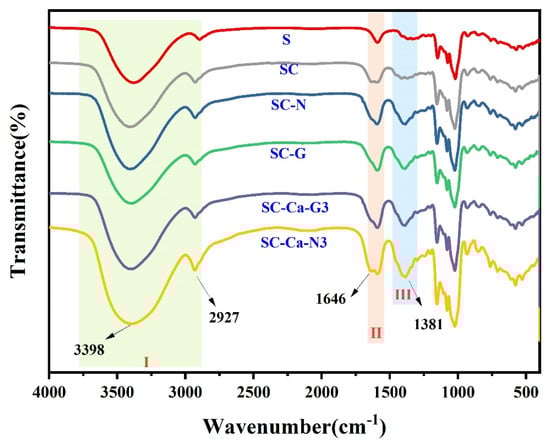 FTIR-ATR was used to determine the changes in the functional groups of the crosslinked modified starch gels. As shown in Figure 4, The broad peak at 3300–3700 cm−1 is assigned to the stretching vibration of hydroxyl (–OH) groups. The absorption peak at 2926 cm−1 is due to the C–H stretching (Figure 4, I). The peak at 1616 cm−1 is due to the bound water. The SC, with the addition of citric acid, showed a new peak at 1646 cm−1 compared to unmodified starch S. This peak confirms the formation of carboxyl and ester carbonyl bond formation [16]. This indicates that citric acid and starch undergo an esterification reaction to form crosslinking bonds. With the addition of an etherified crosslinking agent, SC-G and SC-N showed a new peak at 1381 cm−1 (Figure 4, III), which was attributed to the formation of an ether bond [27]. At the same time, the intensity of the characteristic peaks of the sample’s ester group was weakened (Figure 4, II), confirming the existence of antagonistic effects between different types of crosslinking agents during the crosslinking reaction. This antagonistic effect reduces the overall degree of the crosslinking reaction of the sample. This conclusion is consistent with the pattern of change in the gel properties of the samples in Section 3.1. Notably, after the introduction of cations, the characteristic peaks of the ester group and ether bond of both SC-Ca-N3 and SC-Ca-G3 were significantly enhanced. This suggests that cationic synergistic can effectively promote the esterification–etherification double cross-coupling reaction [28,29].