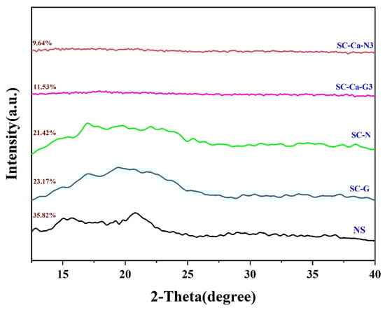 As shown in Figure 5, native regular corn starch displayed a distinctive A-type XRD pattern with strong diffraction peaks at around 15° and 23° 2θ and an unresolved doublet at around 17° and 18° 2θ [30]. In contrast, the crystal structure of the starch gel sample S, which had high-temperature pasting during the extrusion process, was destroyed, and its initial diffraction peak at 2θ = 12.7° disappeared [31]. The SC-N and SC-G with the addition of double crosslinkers showed broad peaks at 2θ = 14°–26° and lost the crystalline peaks usually associated with natural starch, suggesting that their structures are characterized as amorphous [17,27]. Based on the subsequent estimation of the crystallinity, the starch sample SC-Ca-N3 modified using ionic synergistic double crosslinking showed the lowest crystallinity. This phenomenon can be explained by the higher degree of crosslinking of the double crosslinking modification through ion synergism, which restricts the hydrogen-bonding interactions between the chains of starch molecules and hinders the orderly arrangement of these chains during the crystallization process, ultimately leading to a lower degree of crystallinity of SC-Ca-N3 [20,27,32].