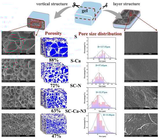 Modifications effect the microstructural properties of samples [18]. Therefore, the samples’ longitudinal structural characteristics and transverse structural characteristics were investigated using scanning electron microscopy (SEM), as shown in Figure 6. The starch gels exhibited a porous network structure in the longitudinal direction. In addition, the pore sizes of the S-Ca, SC-N, and SC-Ca-N3 samples were larger than those of S. The pore size of SC-Ca-N3 was 11.06 μm, and its micropores were the densest. This observation may be the result of the ionic synergistic effect that significantly enhances the double crosslinking reaction, increasing the number of attachment sites between starch chain segments and leading to a dense microporous network structure [33]. Meanwhile, the porosity of SC-Ca-N3 was reduced (47 ± 2%). Decreased porosity means a denser porous structure and greater toughness [34]. The surface of the transverse structure exhibits different structural characteristics from the longitudinal direction. The surface structure of gel S is flat. With the addition of Ca2+, microporous protrusions appeared on the layer surface. However, SC-Ca-N3 has interconnected dense and porous fibrous network-like protrusions. This result may be due to the formation of a flat structure of the starch chains in S through the interaction of hydroxyl groups [35]. In contrast, SC-Ca-N3 contains many crosslinking bonds between the starch chains, which impede the interactions between the starch chains, hindering the movement and stacking of these chains and ultimately forming a porous mesh surface [36,37]. The ionic synergistic double crosslinking reaction promotes the formation of dense gel reticular porous structures. These dense porous structures provide a stronger force-supporting structure for the gels, which appropriately explains the microscopic reason for the excellent elastic modulus of SC-Ca-N3 in Section 3.1.