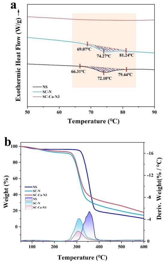 DSC and TG analyses investigated the characteristics of the multiply crosslinked starches. The NS exhibited a single-peak pasting profile at 72.10 ± 0.08 °C (Figure 7a) [38]. On the contrary, the pasting peak of SC-N shifted towards higher temperatures and appeared at 74.27 ± 0.06 °C. Research has shown that enhanced double helixes require higher temperatures for pasting [19,39]. The paste peak of the synergistically crosslinked SC-Ca-N3 disappears (Table 4). The total ΔH of SC-N was significantly reduced from 16.82 ± 0.4 (natural starch) to 13.14 ± 0.08 J/g (p < 0.05) compared to natural starch. The enthalpy of pasting indicates the energy required for the melting of double helices, and the decrease in the enthalpy of pasting suggests that double crosslinking dramatically reduces the crystal structure in starch [40,41,42]. Hydration and swelling of amorphous regions in starch granules promotes crystallization melting. Ionic synergistic dual crosslinking modification inhibits starch granule swelling, prevents melting of starch junction regions, and leads to the disappearance of the pasty peak [38,40,43].