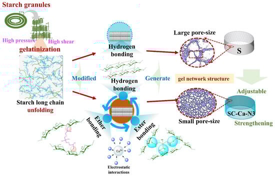 The mechanism of ionic synergistic double crosslinking on the gels was further analyzed based on the experimental results, illustrated in Figure 8. The hydroxyl groups were exposed during the starch gelatinization process. The –COOH groups on the esterified crosslinker molecule crosslink with the surrounding free –OH groups through an esterification reaction and connect multiple long starch chains in its vicinity [47,48]. Meanwhile, the etherified crosslinker CA molecule contains epoxy groups that crosslink to the surrounding free hydroxyl groups via an etherification reaction [49]. Ca2+ cations that uniformly fill the gap between starch and free crosslinker molecules further connect unreacted free hydroxyl, carboxyl, and epoxy groups through electrostatic interactions. This process promotes the proximity of starch molecular chains and the reactive groups of the crosslinker [12,22,49]. As a result, the double crosslinking reactions in starch gels were promoted. As gelation occurs, starch molecular chains aggregate. The gel S collects and forms large pore-size cavities through hydrogen bonding [40,50].