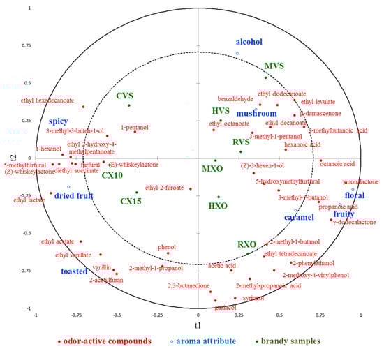 3.3. Correlation between Odor-Active Compounds and Aroma Attributes of Brandies