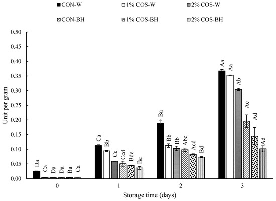 The trypsin activity significantly increased (p < 0.05) from day 0 (0.03 U/g) to day 3 (0.37 U/g) of storage in the CON-W samples. Similarly, the trypsin activity of 1% COS-W and 2% COS-W trypsin increased from 0 U/g to 0.35 and 0.30 U/g, respectively, from day 0 to day 3. All the treated samples with 1% and 2% COS showed lower trypsin activity (p < 0.05). A drastic 3-fold increase in trypsin activity of the HMS meat was found on day 3. This signified that the prior PEF and COS treatment could retard the increase in trypsin activity until day 2 for the whole HMS. However, Chandhi Prashanthkumar et al. [3] reported the rapid augmentation of the trypsin activity on day 1 of storage and remained constant till day 3. This was probably due to differences in the season, habitat, feeds, etc., which could determine the trypsin activity in the different HMS samples. Trypsin mainly caused the rapid protein degradation of the HMS muscle. Thus, the samples treated with COS displayed an inhibition of trypsin to a high degree till day 2 but still had trypsin activity at some level on day 3. The 2% COS-W sample showed lower trypsin activity than the 1% COS-W sample on day 3. For CON-BH, the trypsin activity was augmented significantly from day 1 (0 U/g) to day 3 (0.20 U/g) (p < 0.05). It was noteworthy that the digestive fluid was drained after decapitation. However, a small amount of trypsin still remained inside the cavity of the abdomen, where the digestive tract of the HMS was located. Thus, trypsin activity was still detected in the behead samples. Similarly, the 1% COS-BH and 2% COS-BH samples had trypsin activities of 0.14 U/g and 0.10 U/g, respectively, on day 0 to day 3 of storage. Among all the samples, the 2% COS-BH sample showed the lowest trypsin activity (p < 0.05) at all storage times, as illustrated in Figure 1.