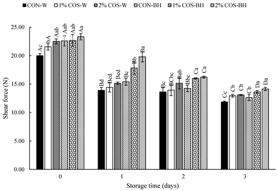 Effects of prior pulsed electric field and chitooligosaccharide at different concentrations on shear force of meat from Harpiosquillid mantis shrimp (Harpiosquilla raphidea) during storage in iced water. Bars represent the standard deviation (n = 3). Different lowercase letters within the same storage times denote significant differences (p < 0.05). Different uppercase letters within the same sample denote significant difference (p < 0.05).
