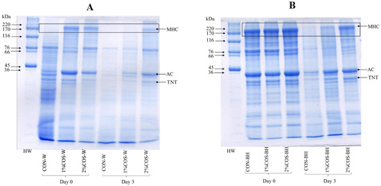 The protein patterns of all the PEF-treated HMS samples, both whole and beheaded, soaked in 0, 1 and 2% COS solutions during 3 days of storage are depicted in Figure 3A and Figure 3B, respectively. For the whole HMS sample, myosin heavy chain (MHC) in CON-W totally disappeared, and actin (AC) was also degraded. The high degradation of MHC might be due to the stabilization of trypsin caused by PEF. Li et al. [17] reported that trypsin stabilized by the PEF with the high-intensity electric field resulted in the degradation of MHC. However, the HMS samples pretreated with PEF and soaked in 1 and 2% COS had retained MHC, AC and TNT bands. This signified that the combined treatment of PEF and COS could prevent the degradation of muscle proteins. The result was consistent with trypsin activity, which became lower after such treatments. However, on day 3, drastic decreases in the band intensity of MHC, AC and TNT were found, except 2% COS-W, which still had a high band intensity of MHC, AC and partial TNT. The results indicated the efficiency in the prevention of the protein degradation of 2% COS treatment of the PEF-pretreated HMS.