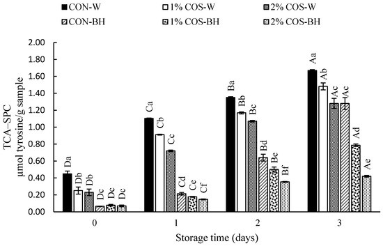 The protein degradation in all the HMS samples, expressed as the TCA-SPC, is presented in Figure 4. At day 0, the TCA-SPC varied from 0.08 to 0.45 µmol tyrosine/g in all the samples; both the whole and beheaded samples. The CON-W sample showed the highest TCA-SPC, which implied the action of PEF in the stabilization of trypsin in the digestive tract. This coincided with the marked degradation of most muscle proteins (Figure 3). The COS-soaked whole samples, including the 1% COS-W and 2% COS-W samples, showed a lower TCA-SPC, by 44.04% and 48.69%, respectively. A reduction in degradation by 82.72% and 84.35%, respectively, were found in the beheaded samples. On day 1, the whole samples showed a higher TCA-SPC than the beheaded samples, regardless of COS treatment. The CON-W sample had the highest TCA-SPC. The descending order of the TCA-SPC was found as follows: 1% COS-W, 2% COS-W, CON-BH, 1% COS-BH, and 2% COS-BH, in which the TCA-SPC was less than that of the CON-W sample by 17.19%, 34.79%, 80.66%, 83.83% and 86.72%, respectively. Similarly, a trend was found on day 2 and day 3. The 2% COS-BH sample had the lowest TCA-SPC, which was lower than that found in the CON-W sample by 73.77% and 74.63% on day 2 and 3, respectively. In general, the increase in the TCA-SPC was noted from day 0 to Day 3. The TCA-SPC was increased by 3–4 folds at day 3. All the results aligned with the increased trypsin activity, upsurged degradation of muscle proteins and lower shear force for the CON-W sample as the storage time upsurged. However, the 2% COS-BH sample had much lower changes. The TCA-SPC found in all samples on day 0 was probably due to the partial degradation of muscles caused by high-intensity PEF. In addition, PEF could stabilize the trypsin, which was responsible for the degradation of MHC. Thus, this phenomenon favored the hydrolysis of MHC and other proteins. Chanchi Prashanthkumar et al. [3] reported that endogenous enzymes were involved in the proteolysis or hydrolysis of muscle proteins. Notably, the 2% COS-BH sample displayed resistance to hydrolysis by endogenous enzymes, especially trypsin.