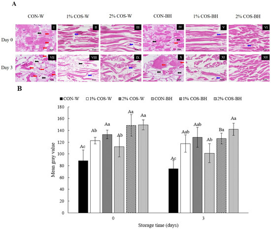 The histological or microstructural changes in muscle tissue correspond to the texture and quality changes in meat [21]. Overall, three distinct muscle tissue changes, including autolysis, causing loss of muscle striation and architecture, fiber splitting or gapping of muscle fibers and disappearance of muscle fibers, were observed. These changes were varied with samples as influenced by different treatments (Figure 5A). The fresh muscles exhibited a significantly tight structure with no discernible histological changes. At day 0, the 1% COS-W and 2% COS-W samples showed the order alignment of fibers, while the CON-W sample had the disintegrated arrangements of fibers or disappearance of fibers. This was related to the complete disintegration of MHC (Figure 5A(I)). After 3 days of storage, the gapping was more evident for those treated with COS at both levels. The CON-W sample underwent more disruption of the muscle fibers. On the other hand, the BH sample treated with 2% COS (2% COS-BH) still possessed a more ordered fiber structure than the others. This was confirmed by the maintenance of the MHC and actin of this sample as indicated by the SDS-PAGE protein pattern (Figure 3). Consequently, this tight and dense muscle structure rendered a very high mean grey intensity (MI), contributing to a darker appearance (Figure 5B). In general, the muscles of the 2% COS-BH sample on day 0 exhibited the highest MI values. Similar results were found for the 1% COS-BH and 2% COS-BH samples, which showed a higher MI value than the CON-BH sample. Those samples displayed similar trends, compared to those found on day 3. Overall, the MI value was higher in the BH samples than the whole sample. This suggested that the decapitation provided tissue stability, as witnessed by the higher MI values.